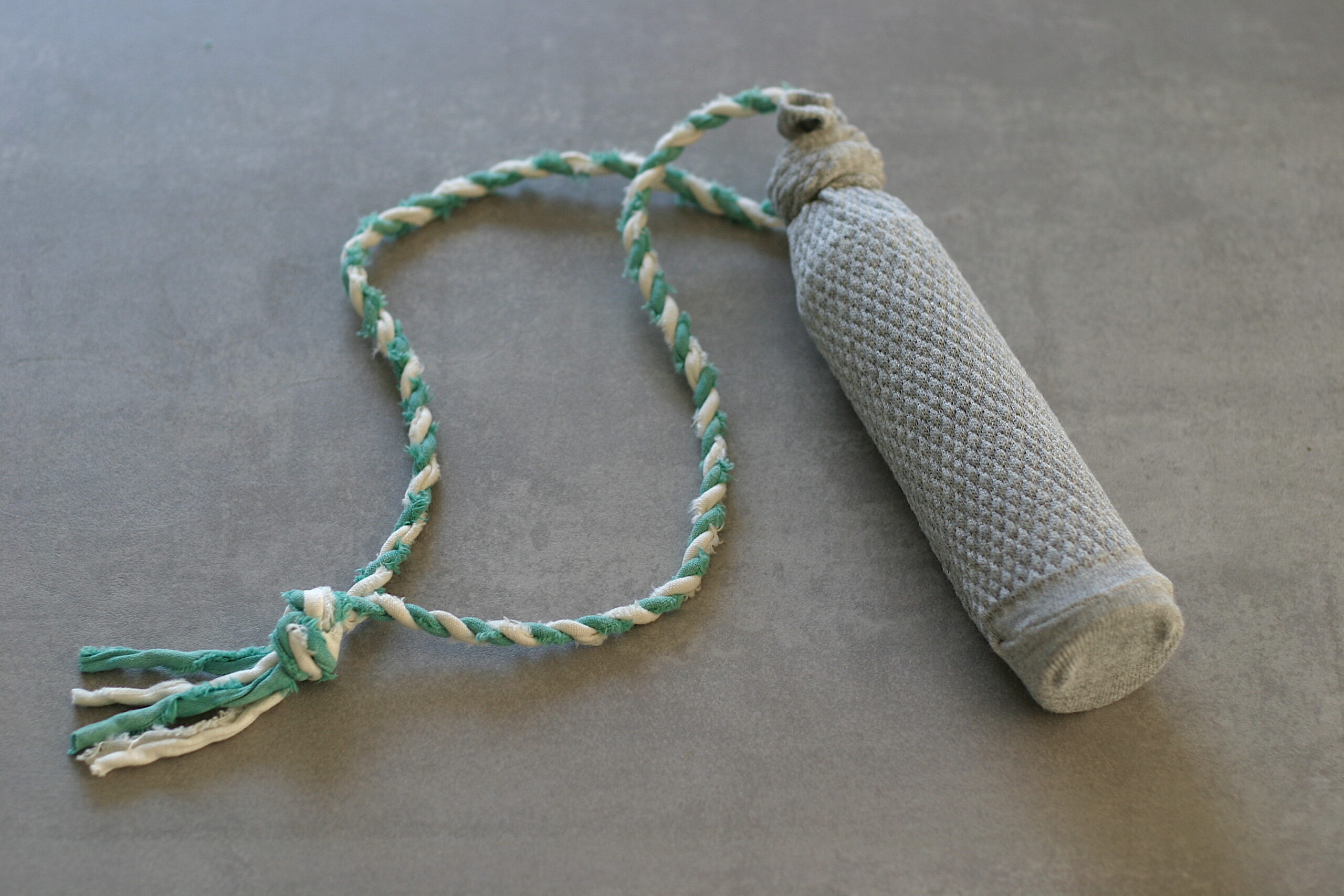 Als Hohlkörper ist eine leere, maximal 0,5 Liter fassende Plastikflasche – von einem Getränk oder Shampoo – perfekt. Diese spült man aus, löst etwaige Etiketten und kann ein wenig Sand für optimiertes Flugverhalten einfüllen. Dann den Deckel fest verschließen. Einzelne Strümpfe kommen in den besten Schränken vor; in einem aus festem Stoff wird die vorbereitete Buddel versenkt. Beim Verknoten des Sockenbundes eine Kordel als Handschlaufe befestigen. Das Spielzeug fliegt und schwimmt prima und liegt leicht und weich im Hundemaul. So kann der Vierbeiner die Beute entweder laufend oder schwimmend aus dem Wasser holen. Aufgepasst: Vor lauter Tatendrang sind einige Hunde kaum zu bremsen – die selbstgebastelte Flaschenpost sollte daher nicht zu oft oder zu weit geworfen werden!